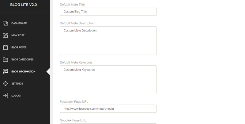 La página de información del blog en el panel te permite configurar títulos meta, descripciones y palabras clave personalizadas para mejorar tu SEO. También puedes cambiar el fondo de la cabecera, el logo y los enlaces a tus perfiles de Facebook, Instagram y Twitter.