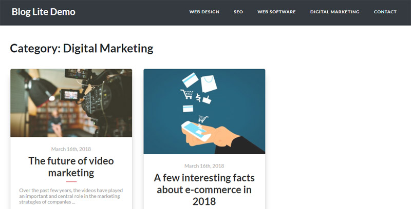 Tus usuarios pueden explorar las entradas por categorías (disponibles en el menú principal y en el pie de página) y ver los últimos artículos en la página de inicio, cada uno con su imagen, título, fecha y un extracto del contenido.