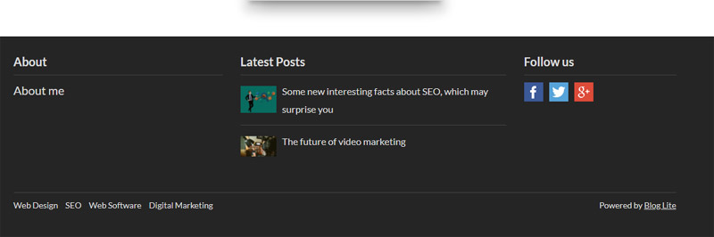 El pie de página muestra enlaces a tus redes sociales (configurables desde el panel), así como las últimas entradas, un texto de "sobre mí" y enlaces rápidos a las categorías del blog.