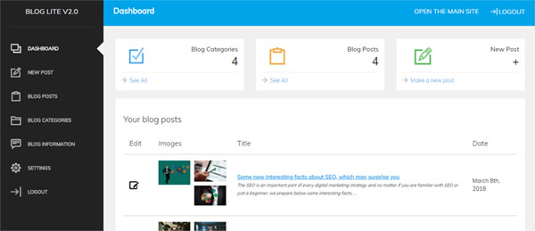 Blog Lite es un script de blog en PHP diseñado para que puedas crear rápidamente sitios de blog sencillos o añadir una sección de noticias a cualquier web que ya tengas.