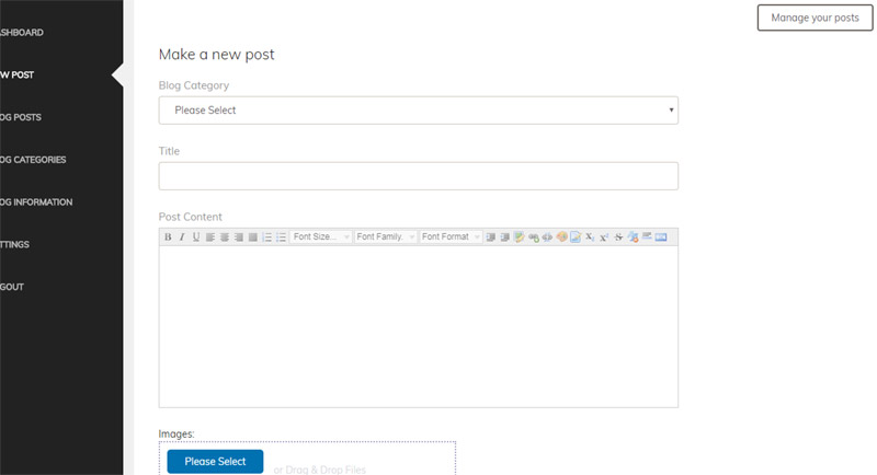 Al crear una nueva entrada, puedes seleccionar la categoría, escribir el título y dar formato al contenido con el editor web incluido. También puedes adjuntar varias fotos a tu publicación, que se mostrarán como una galería elegante en la página de detalles del blog.