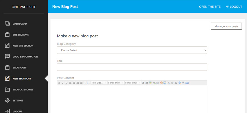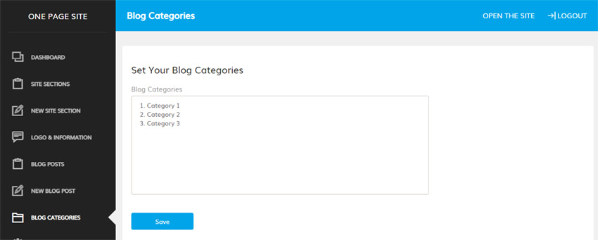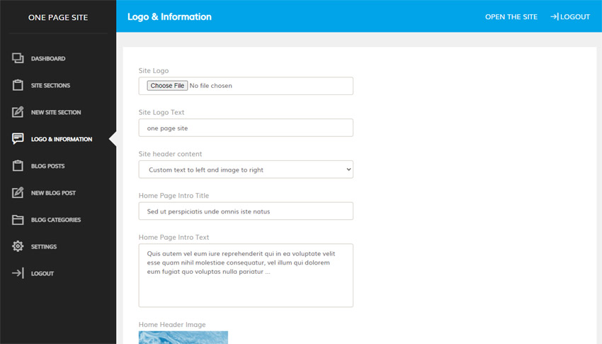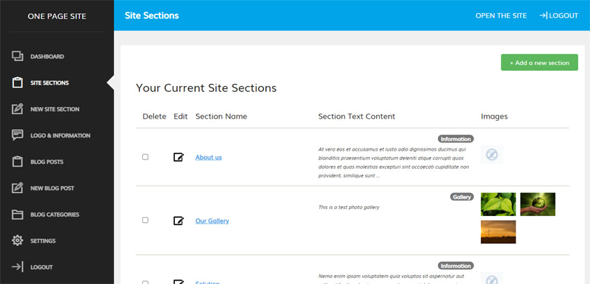 Las secciones representan los diferentes párrafos del sitio; los usuarios pueden navegar entre ellas haciendo clic en los enlaces del menú principal (las secciones se muestran al instante y sin recargar la página). Desde el panel de control, el administrador puede crear y editar las secciones necesarias, seleccionando el tipo de sección e introduciendo su nombre, texto e imágenes.