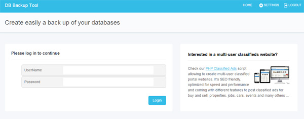 Avec l’Outil de Sauvegarde, vous visualisez les bases de données de votre site sous forme de liste. Pour sauvegarder une base, il vous suffit de cliquer sur son nom. Le panneau d’administration est protégé par mot de passe et, pour une sécurité accrue, vous pouvez renommer le dossier d’installation comme bon vous semble.